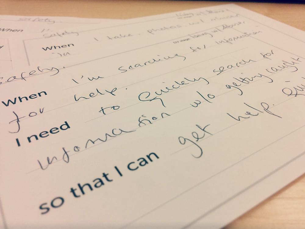 Simply put, who would be using your product or service? What are their hopes and motivation for using your product or service? Working in pairs, we came up with several personas, each at a different stage of their abusive relationship (pre-awareness, wanting to leave, escaped & in recovery etc.] Personas are really useful to illustrate who we are designing for. It’s also a good reminder for us that we are researching and designing with victims and survivors in mind, at every stage of the project.